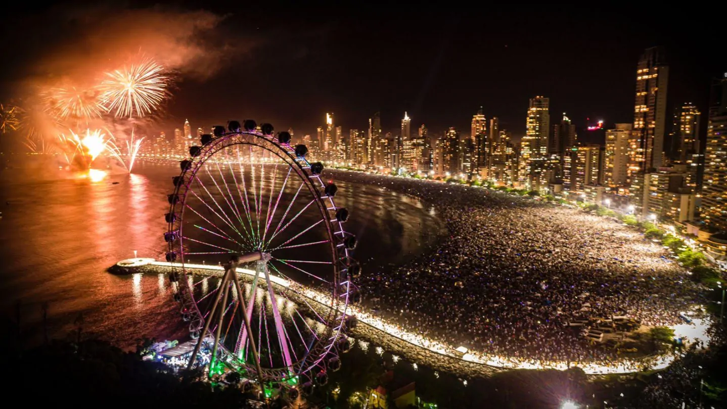Balneário Camboriú (SC) Praia Central com fogos de 15 minutos. Sem shows gratuitos, mas festas privadas luxuosas como Réveillon Green Valley (ingressos acima de R$ 2 mil).